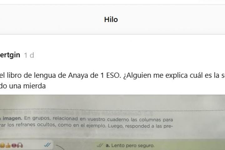 Un caso de estos está en boca de muchos en las últimas horas, después de que lo haya publicado en la red social Threads el usuario @albertgin junto al mensaje: "Ejercicio del libro de lengua de Anaya de 1 ESO. ¿Alguien me explica cuál es la solución? No entiendo una mierda".