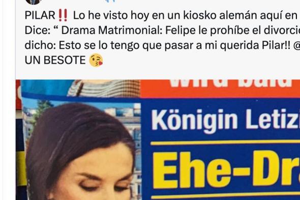 "Lo he visto hoy en un kiosko alemán aquí en Colonia. Dice: 'Drama Matrimonial: Felipe le prohíbe el divorcio'. Al verlo me he dicho: Esto se lo tengo que pasar a mi querida Pilar!!", dice el usuario que se ha encontrado con la revista.