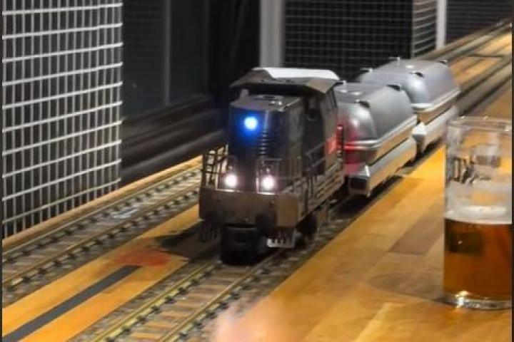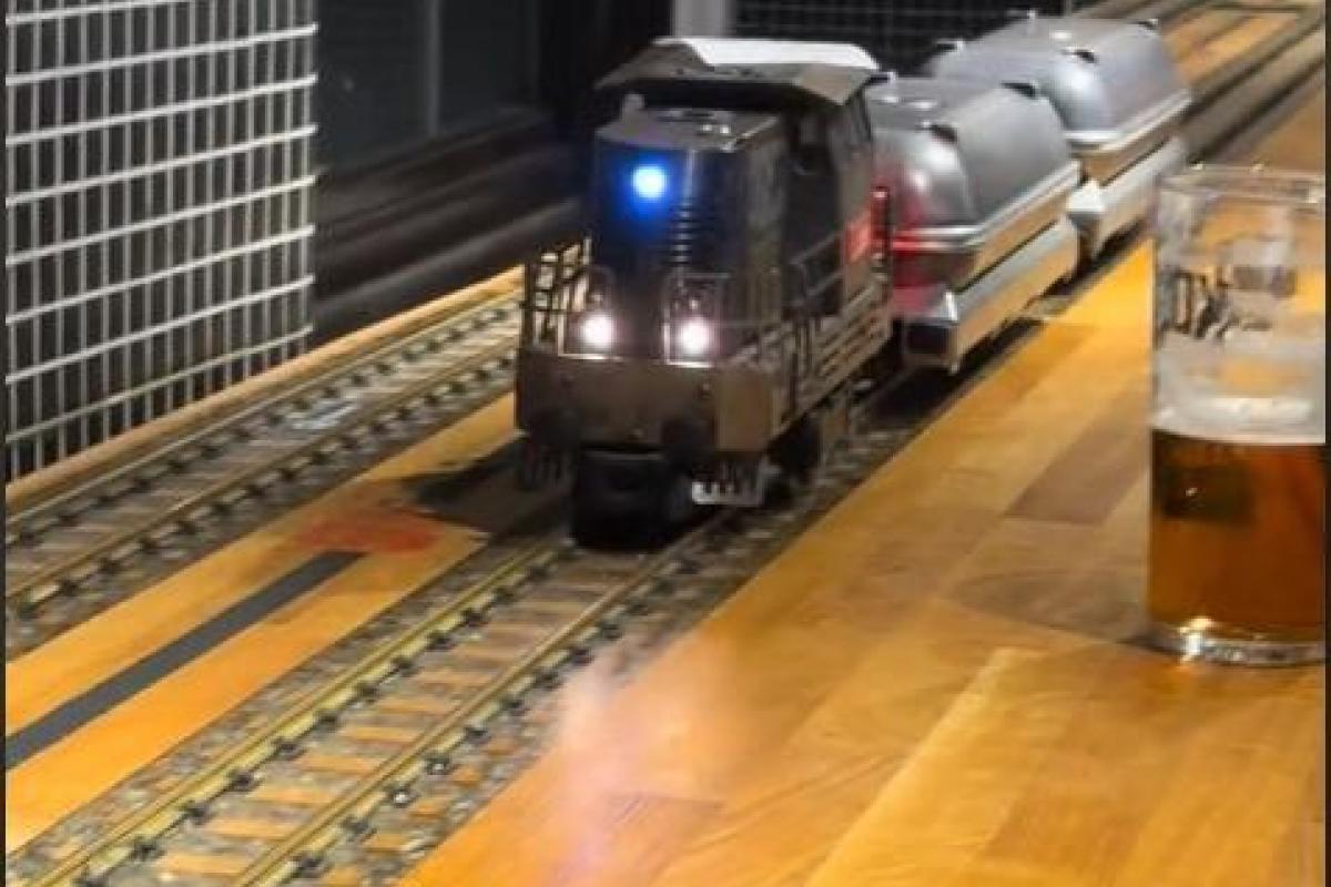 En concreto, lo curioso del restaurante es que la comida está servida por trenes que transportan la comida y la bebida de los clientes y circulan por encima de una barra, parándose justo delante de la persona para la que va la comanda.