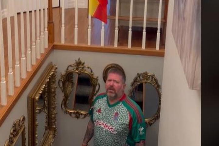 Ha viajado muchas veces a España y se sospecha que es a partir de esos momentos en los que se enamoró del país. En el último vídeo publicado, su mujer, una vez más, le reprocha colgar la bandera en el primer sitio que se encuentre y le venga bien. Esta vez ha sido en su casa, pero la ha dejado colgando en el candelabro.