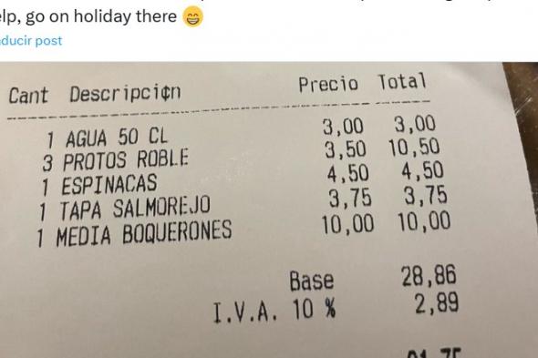 "Los precios en España no son reales. Tres platos deliciosos, agua y tres copas de buen vino tinto", dice junto a una foto de la cuenta, que asciende a 31,75 euros.