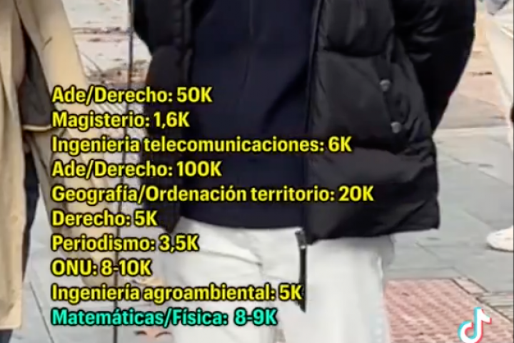 Otro quiere trabajar en la ONU con un rango máximo de entre 8.000 y 10.000 euros al mes y, por último, un joven que estudia el doble grado de Matemáticas y Física señala que va a cobrar entre 8.000 y 9.000 euros al mes.