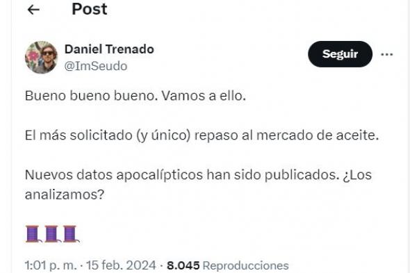 El agricultor Daniel Trenado ha publicado en su cuenta de X (@ImSeudo) un hilo al título de "un repaso al mercado de aceite" asegurando que los "nuevos datos" publicados son "apocalípticos".