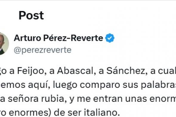 "Oigo a Feijoo, a Abascal, a Sánchez, a cualquier rascapuertas de los que tenemos aquí, luego comparo sus palabras, tono y contenido con los de esta señora rubia, y me entran unas enormes ganas (momentáneas, pero enormes) de ser italiano", ha señalado el escritor en un mensaje que tiene un alcance de 2,4 millones de personas.