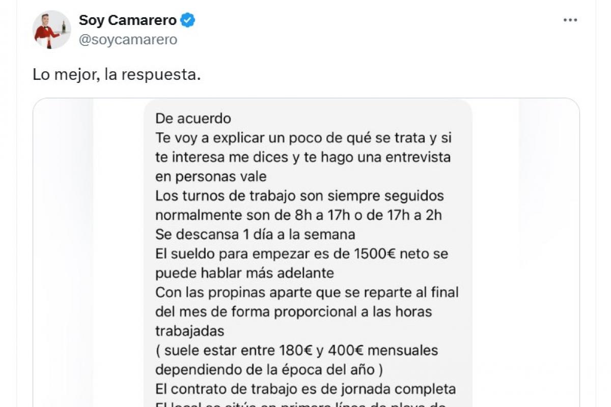 Un trabajador de la hostelería ha provocado un encendido debate con la respuesta que le ha dado a un empresario que le ofrecía unas condiciones de trabajo que están dando mucho que hablar.