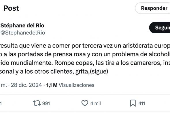 Más de un millón de personas han visto para por su muro de X (antes Twitter) lo que le ha ocurrido en su restaurante al cocinero @StephanedelRio con un "un aristócrata europeo asiduo a las portadas de prensa rosa".
