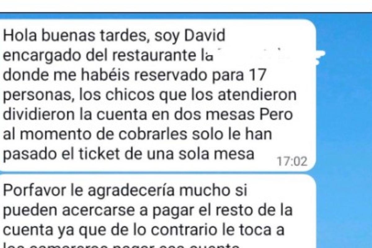 En los pantallazos de WhatsApp se ve cómo el hostelero le dice al cliente: "Hola, buenas tardes, soy David, encargado del restaurante donde me habéis reservado para 17 personas. Los chicos que los atendieron dividieron la cuenta en dos mesas, pero al momento de cobrarles solo le han pasado el ticket de una sola mesa".