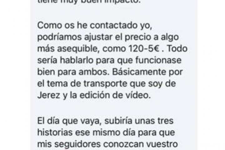 "Los locales se llenan y tienen muy bien impacto. Como os he contactado yo, podríamos ajustar el precio a algo más asequible, como 120-5 euros. Todo sería hablarlo para que funcionase bien para ambos. Básicamente por el tema de transporte que soy de Jerez y la edición de vídeo. El día que vaya subiría unas tres historias ese mismo día para que mis seguidores conozcan vuestro local", proseguía.