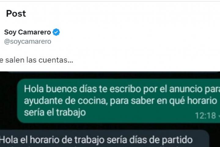 Para muestra, la conversación de WhatsApp que un aspirante a cocinero ha tenido con un hostelero. "Hola, buenos días. Te escribo por la oferta de ayudante de cocina, para saber en qué horario sería el trabajo", quiere saber el empleado.