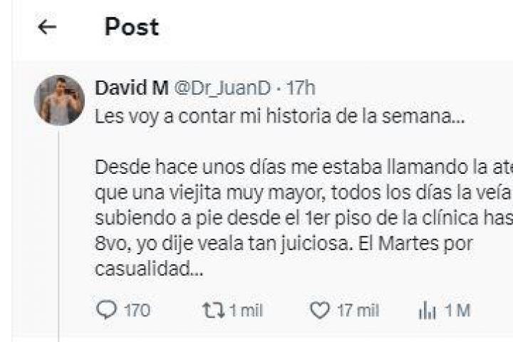 El doctor conocido en la red como @Dr_JuanD ha relatado en su cuenta de X lo que ha ocurrido esta semana con una persona mayor que llevaba días llamándole la atención porque "todos los días subía a pie desde el primer hasta el octavo piso de la clínica".
