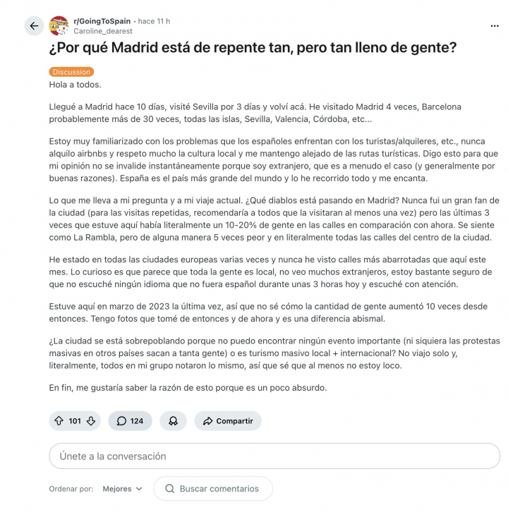 "¿La ciudad se está sobrepoblando porque no puedo encontrar ningún evento importante (ni siquiera las protestas masivas en otros países sacan a tanta gente) o es turismo masivo local más internacional? No viajo solo y, literalmente, todos en mi grupo notaron lo mismo, así que sé que al menos no estoy loco. En fin, me gustaría saber la razón de esto porque es un poco absurdo", ha zanjado.