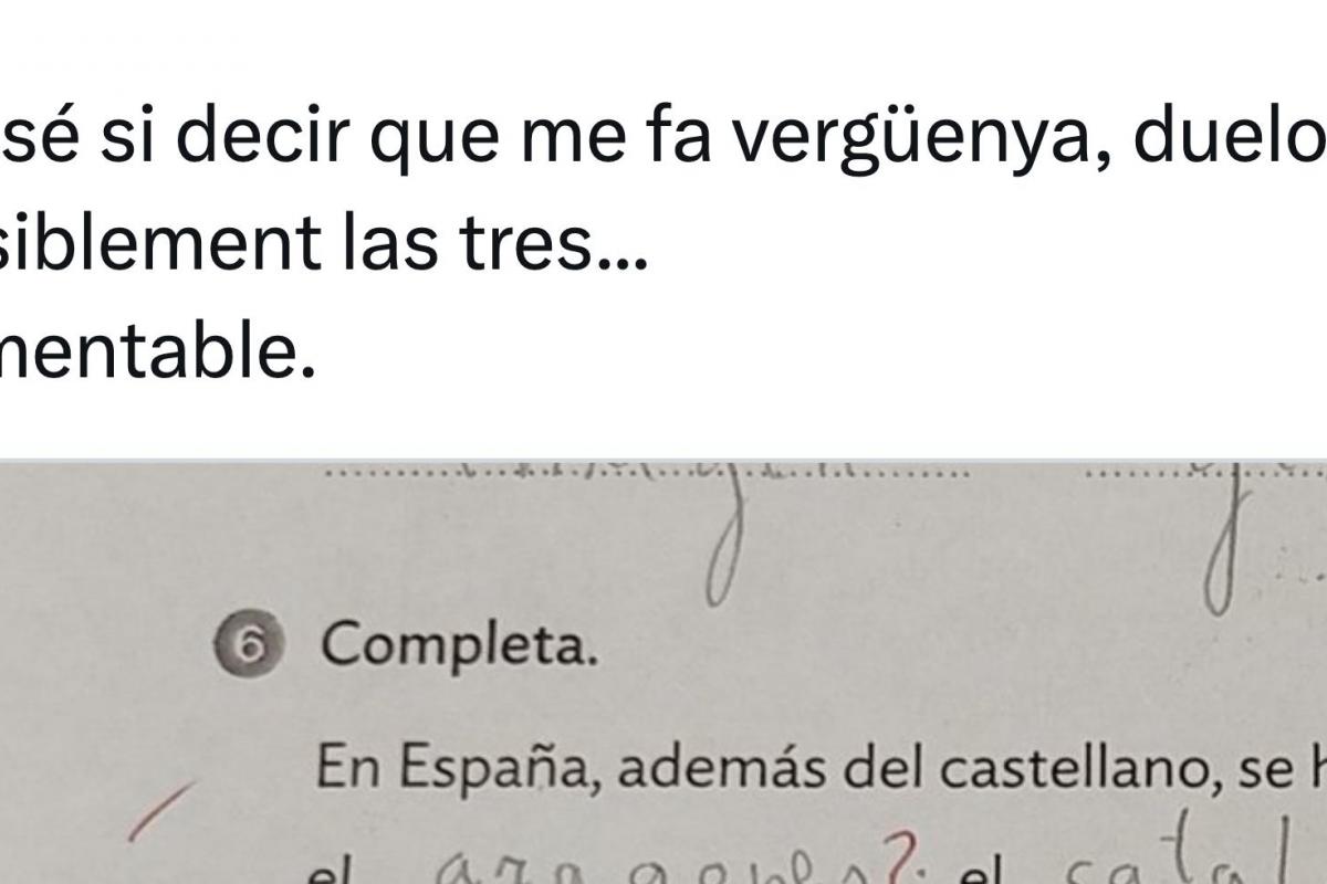 "En España, además del castellano, se habla otras lenguas como", reza el enunciado. Y las respuestas de la alumna han sido: "Aragonés, catalán y el vasco". Como se puede ver en la foto que ha compartido el padre, la profesora ha tachado "aragonés" y ha escrito "gallego".
