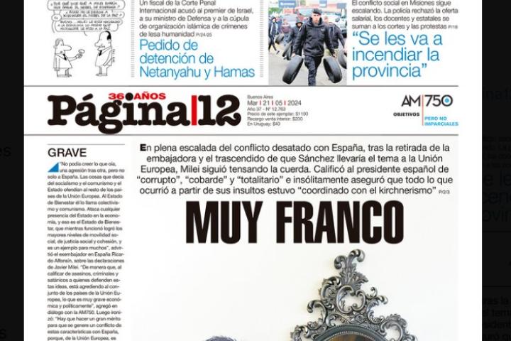 El periódico argentino Página/12 ha levantado ampollas entre algunos sectores en España con la portada que ha dedicado a la crisis institucional que ha generado el presidente de aquel país, Javier Milei, por llamar corrupta a Begoña Gómez, mujer del presidente del Gobierno, Pedro Sánchez.