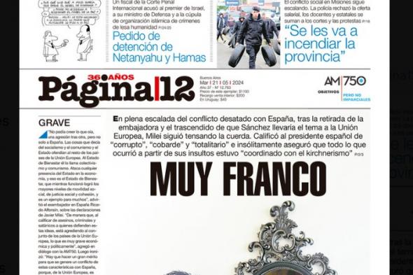 El periódico argentino Página/12 ha levantado ampollas entre algunos sectores en España con la portada que ha dedicado a la crisis institucional que ha generado el presidente de aquel país, Javier Milei, por llamar corrupta a Begoña Gómez, mujer del presidente del Gobierno, Pedro Sánchez.
