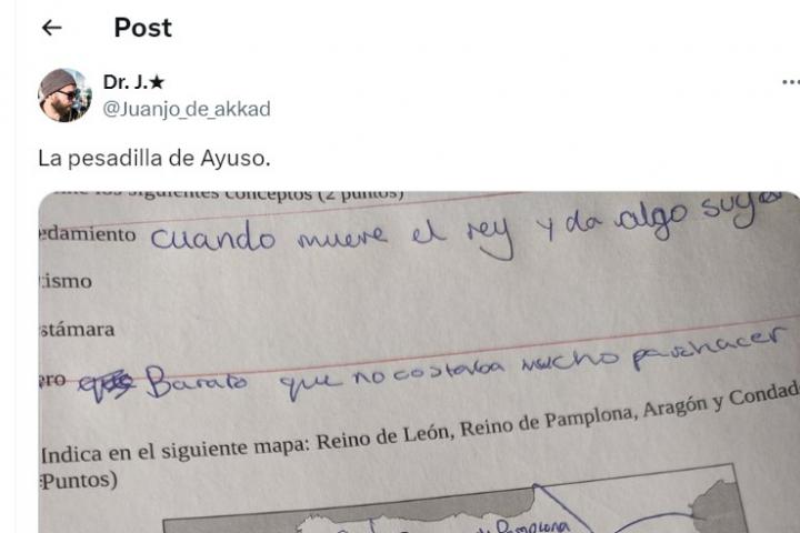 Un profesor comparte la respuesta de un alumno en un examen: dice que sería "la pesadilla de Ayuso"
