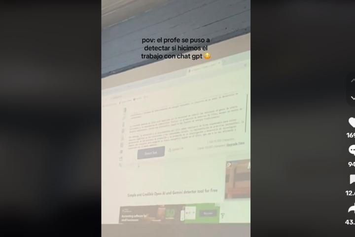 En el vídeo en cuestión se ve cómo el docente proyecta un trabajo de unos alumnos ante la clase. "El profe se puso a detectar si hicimos el trabajo con ChatGPT", dice la usuaria que lo ha subido, @iam.tamarag.