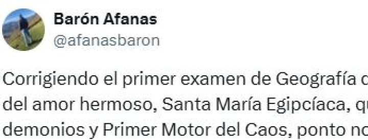 "Corrigiendo el primer examen de Geografía de 2ª de Bachillerato... Madre del amor hermoso, Santa María Egipcíaca, que Azathoth, sultán de los demonios y Primer Motor del Caos, pronto nos lleve a su pozo de oscuridad donde entona sus demenciales melodías", ha expresado en un tuit, que ha alcanzado cientos de miles de reproducciones y 1.000 'me gusta' (que no dejan de subir).