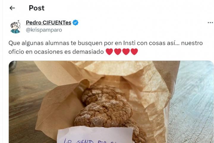 "Que algunas alumnas te busquen por en Insti con cosas así… nuestro oficio en ocasiones es demasiado ❤️❤️❤️❤️", ha escrito.