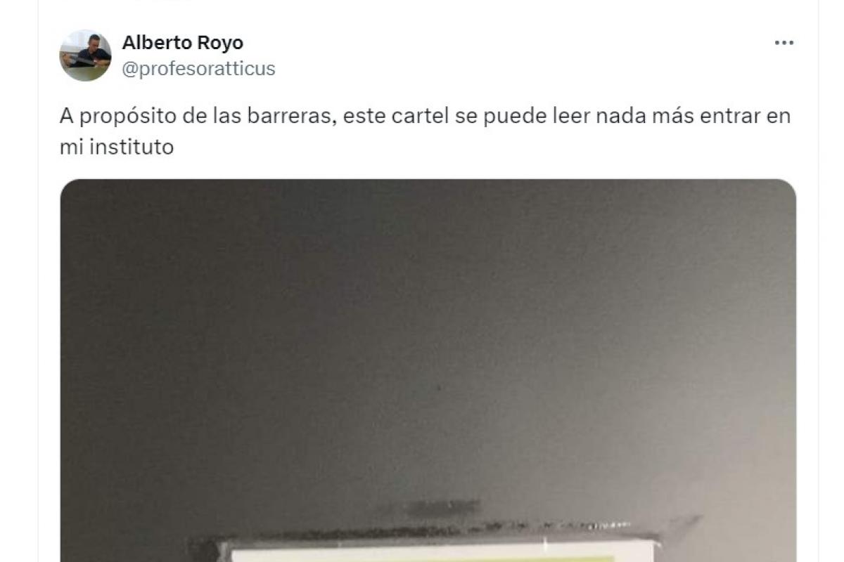 "A propósito de las barreras, este cartel se puede leer nada más entrar en mi instituto", ha escrito el docente.