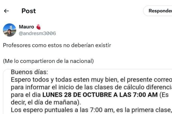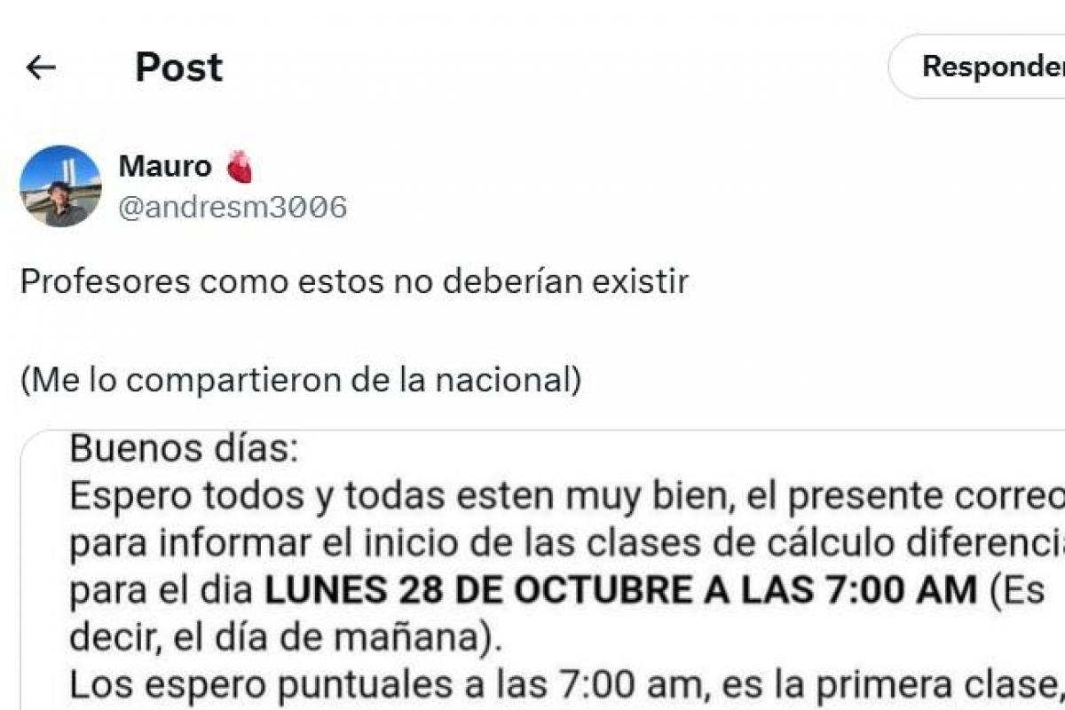 En el correo en cuestión se puede leer: "Buenos días: espero todos y todas estén muy bien, el presente correo es para informar el inicio de las clases de cálculo diferencial para el día lunes 28 de octubre a las 7.00 (es decir, el día de mañana). Los espero puntuales a las 7.00 am, es la primera clase, no empiecen conmigo con el pie izquierdo llegando fuera del horario, además que hay que hablar cosas importantes".