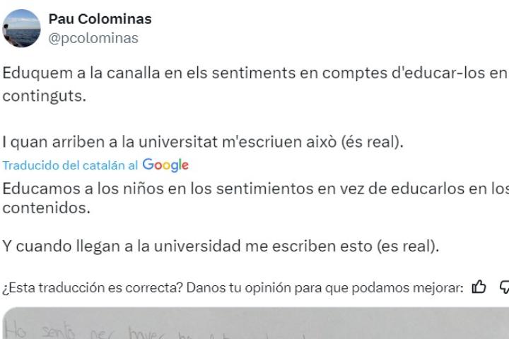 "Educamos a los niños en los sentimientos en vez de educarlos en los contenidos", ha sentenciado el docente antes de rematar: "Y cuando llegan a la universidad me escriben esto (es real)".