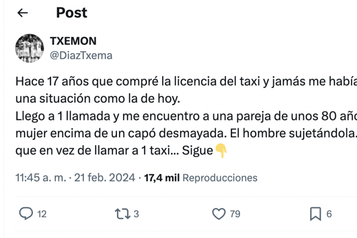 El usuario de X @DiazTxema adquirió su licencia de taxi hace nada menos que 17 años y "jamás" se había visto en una situación como la de este miércoles, cuando ha tenido que llevar a Urgencias a una mujer al borde del colapso.