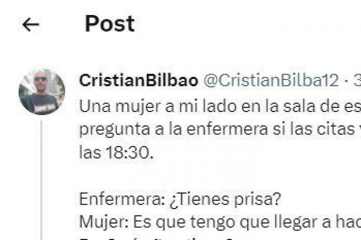 "Nerviosa, le ha preguntado a la sanitaria si las citas iban con mucho retraso. Eran las 18:30", ha empezado explicando el internauta para añadir contexto.