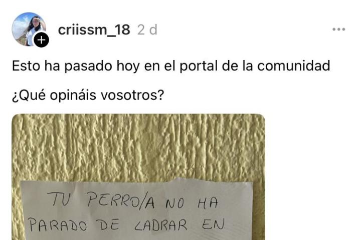 En el letrero, subido a Threads por @criissm_18, se puede leer: "Tu perro/a no ha parado de ladrar en todo el fin de semana. ¡¡Es insoportable!! ¡¡Busca una solución!! ¡¡Por favor!!".