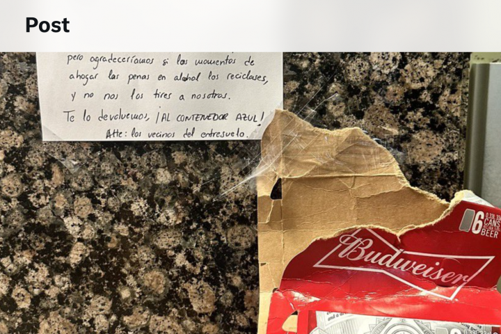 "Te lo devolvemos. Al contenedor azul. Atentamente, los vecinos del entresuelo", se lee en la última frase del cartel. Junto al folio en cuestión hay un trozo de cartón de una marca de cervezas.