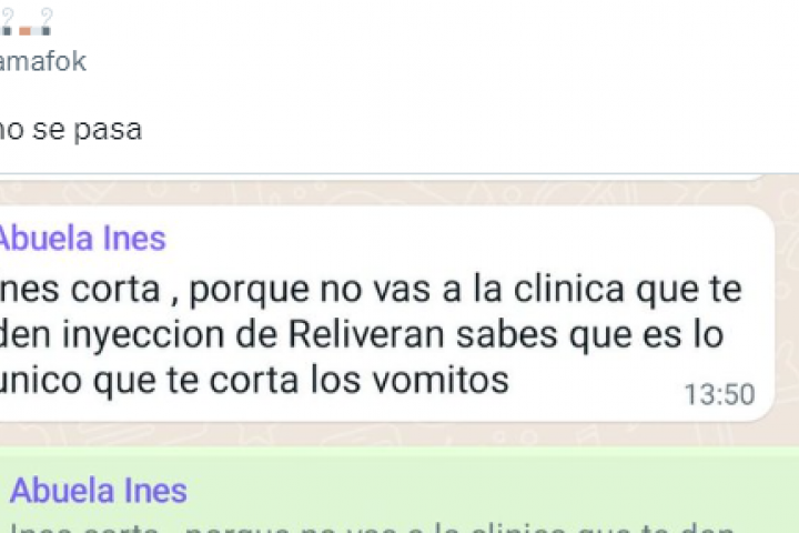 Su abuela Inés había mandado el siguiente mensaje: "Inés corta, ¿por qué no vas a la clínica que te den inyección de Reliveran? Sabes que es lo único que te corta los vómitos".