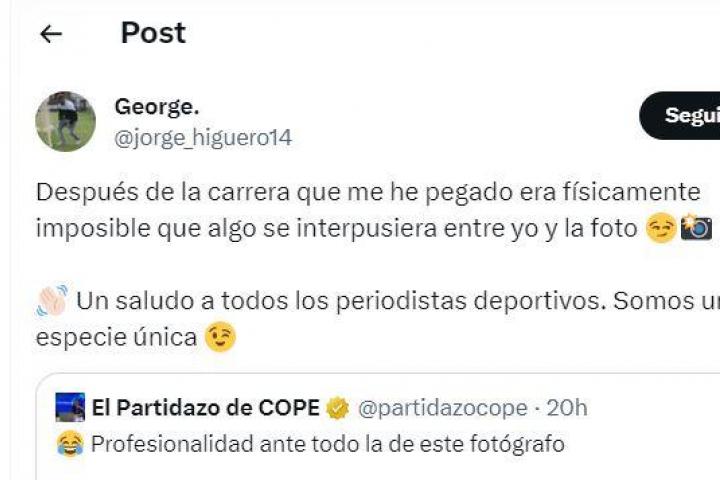 "Después de la carrera que me he pegado era físicamente imposible que algo se interpusiera entre yo y la foto", ha escrito Jorge Higuero, periodista y autor de la hazaña, en su cuenta de X.