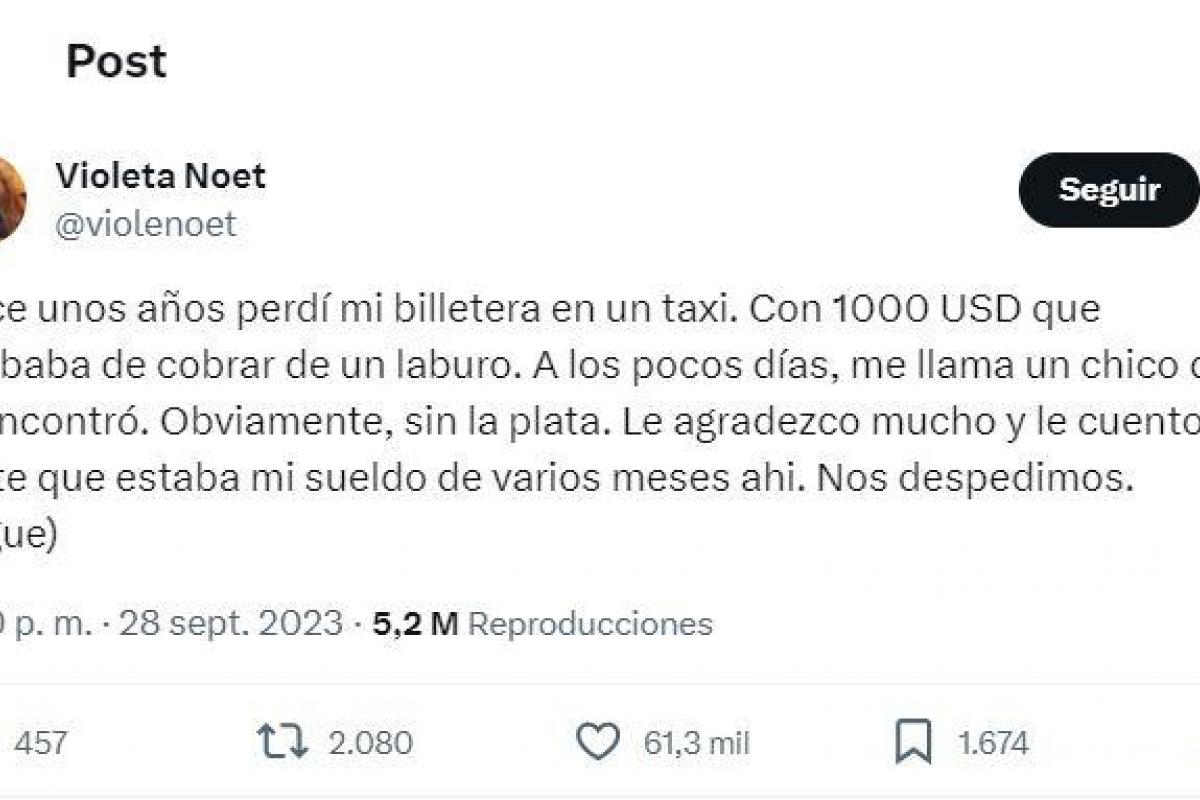 "Perdí mi billetera en un taxi. Con 1000 USD que acababa de cobrar de un laburo. A los pocos días, me llama un chico que la encontró", ha empezado explicando la tuitera.