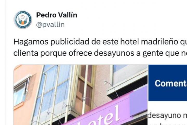 Vallín ha compartido un pantallazo de la misma haciendo la siguiente reflexión: "Hagamos publicidad de este hotel madrileño que ha molestado a una clienta porque ofrece desayunos a gente que no los puede pagar".