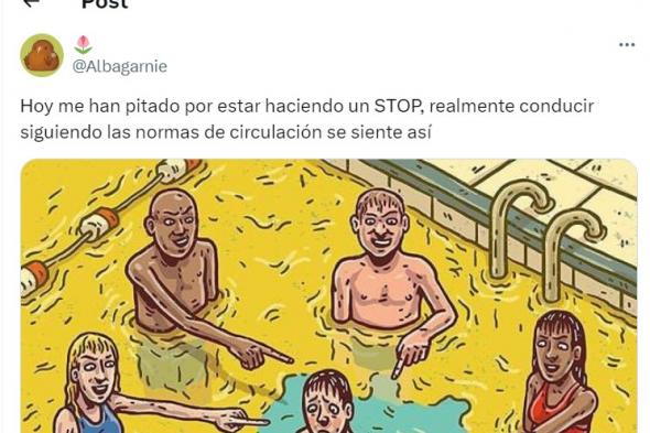 Pues bien, una conductora compartió su experiencia en la red social: "Hoy me han pitado por estar haciendo un STOP, realmente conducir siguiendo las normas de circulación se siente así". Y ahí ha subido un dibujo en el que varias personas señalan con el dedo a otra que parece haberse orinado en una piscina.