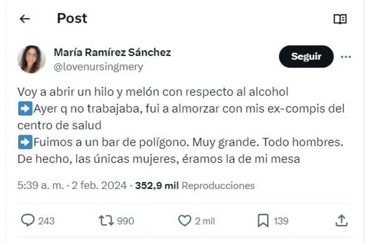 La usuaria de X @lovenursingmery es enfermera y ha hecho una reflexión de lo más necesaria acerca del consumo de alcohol tras quedar con unos antiguos compañeros del centro de salud en el que trabajaba.