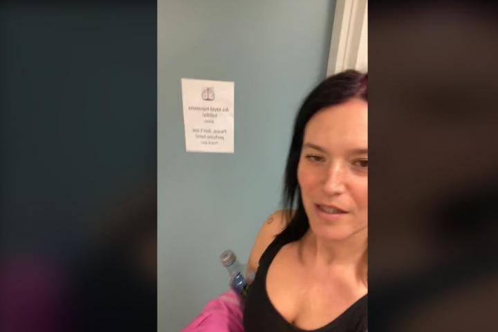 "Cosas que me llaman la atención de Finlandia: aquí en el gimnasio, en pleno vestuario, tenemos un cartelito", dice mientras de fondo de ve el letrero.