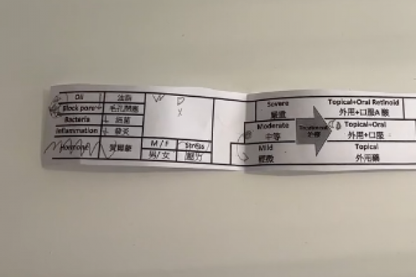 Ha explicado que ha ido al médico porque le está saliendo acné por la cara y quería que el dermatólogo la viese. El doctor le ha sacado un papel "del acné" en el que ha ido tachando las cosas que no son probables.