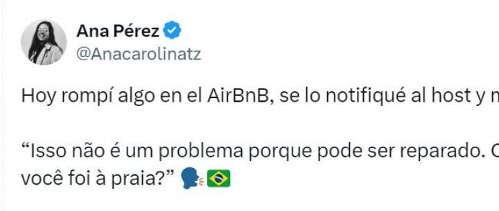 La tuitera Ana Pérez (@Anacarolinatz) ha subido una publicación a su cuenta de la red social X, anteriormente conocida como Twitter, contando la respuesta que ha recibido de su anfitrión de AirBnB en Brasil tras notificarle que le había roto algo de la casa.