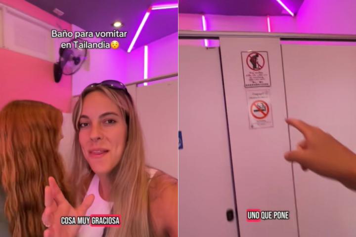 "Entonces te dan la opción de que hay un baño solo para vomitar", agrega la misma, quien enseña el otro cartel, donde se puede leer 'Vomiting Room'. "Es muy inteligente, es que es mejor que la gente vomite aquí", agrega su amiga rápidamente.