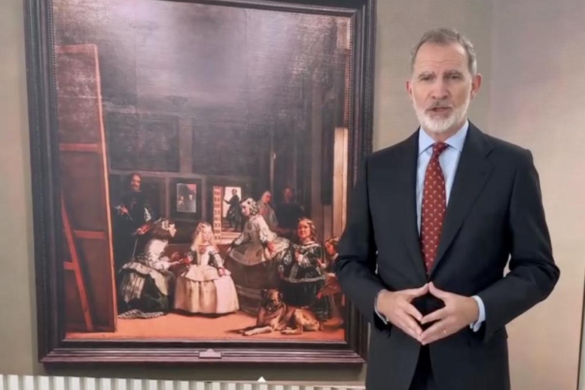 "Este es un cuadro perfectamente reconocible en todo el mundo, pintado por Velázquez en 1656 y que retrata a la familia real y a su corte en un salón del antiguo Alcázar de los Austrias en Madrid, donde hoy se encuentra el Palacio Real", ha contado el rey a los espectadores.