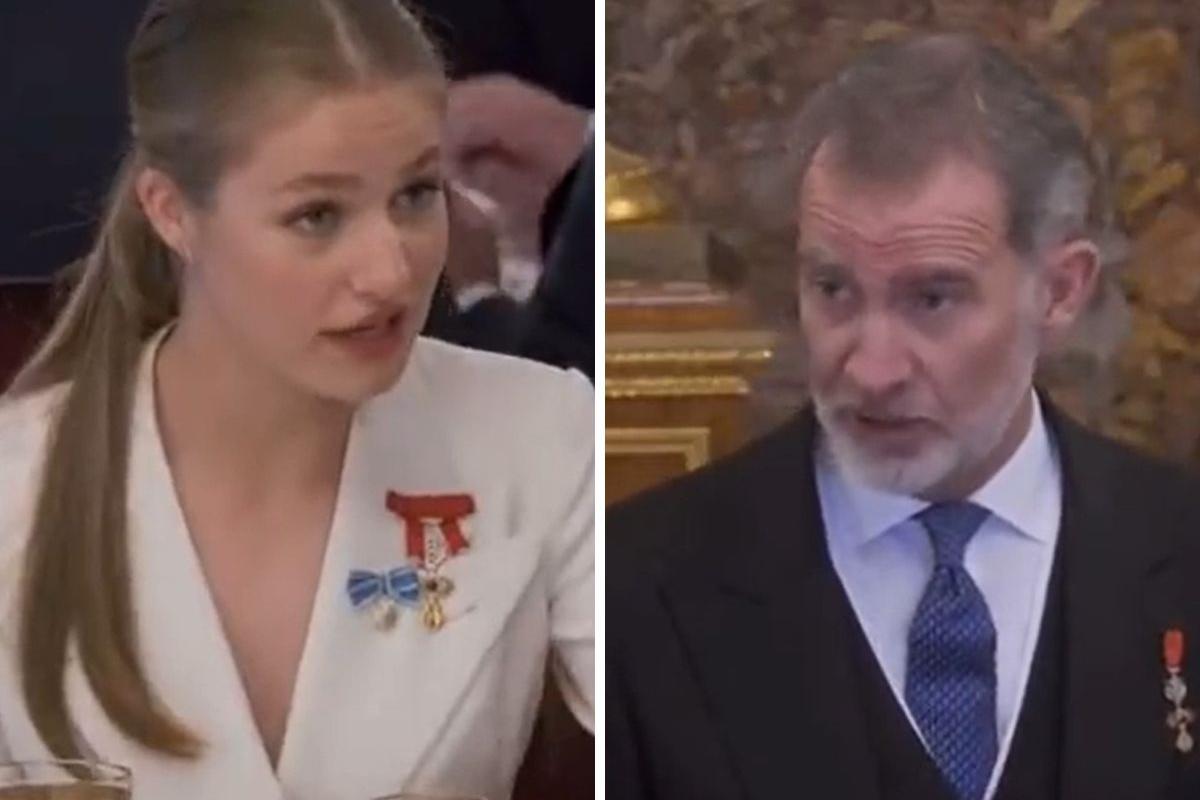 La princesa Leonor y su padre, el rey Felipe VI, han protagonizado un llamativo momento que han captado perfectamente las cámaras al inicio del almuerzo en el Palacio Real con motivo de la jura de la Constitución de la heredera.
