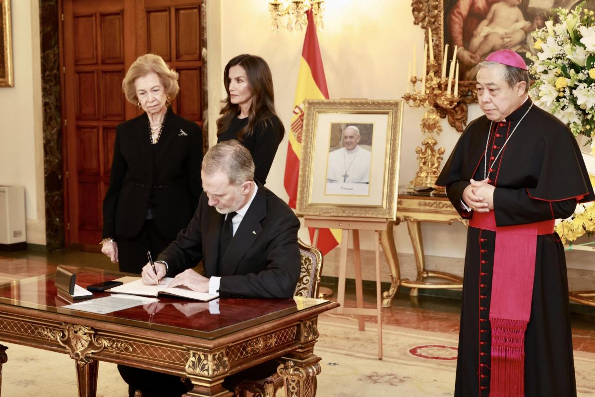 "Nuestro recuerdo más sentido a la figura y personalidad irrepetibles de Su Santidad el papa Francisco, que trasciende su dimensión eclesiástica; y nuestra admiración y respeto por su total entrega a la tarea evangélica hasta el último aliento de su vida", se puede leer en libro de condolencias. Unas palabras que firman Letizia, Felipe VI y la reina Sofía.