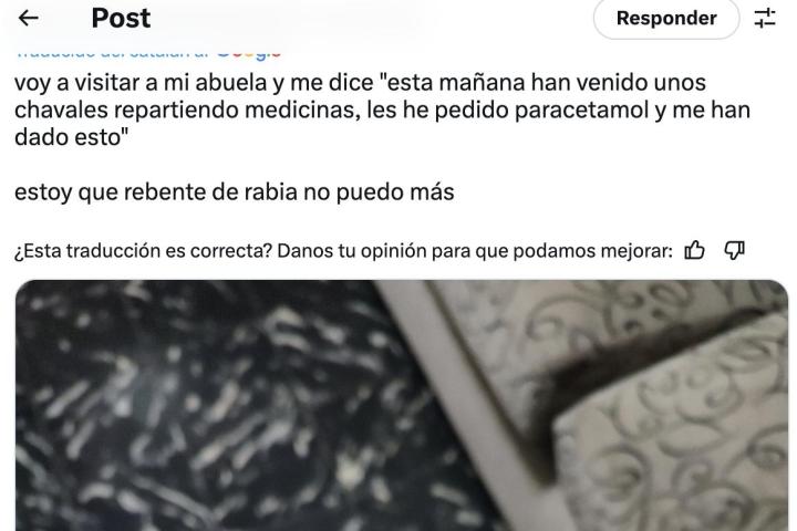 "Voy a visitar a mi abuela y me dice 'esta mañana han venido unos chavales repartiendo medicinas, les he pedido paracetamol y me han dado esto'. Estoy que reviento de rabia no puedo más", ha dicho junto a una foto de la caja en cuestión.