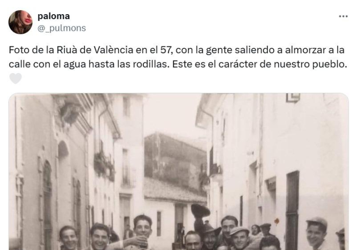 "Foto de la Riuà de València en el 57, con la gente saliendo a almorzar a la calle con el agua hasta las rodillas. Este es el carácter de nuestro pueblo", ha publicado orgullosa la tuitera.