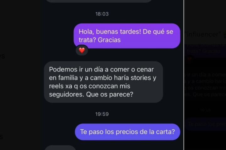 "Hola! Me gustaría saber si estáis interesados en realizar una colaboración. Saludos", escribió la influencer. El hostelero quiso saber de qué se trataba y ella le explicó: "Podemos un día a comer o cenar en familia y a cambio haría stories y reels para que os conozcan mis seguidores. ¿Qué os parece?".