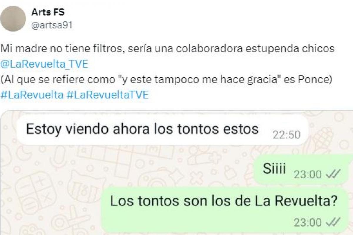 "Mi madre no tiene filtros, sería una colaboradora estupenda chicos de @LaRevuelta_TVE (Al que se refiere como 'y este tampoco me hace gracia' es Ponce)", aseguró el usuario de la red social de X junto al pantallazo de WhatsApp.