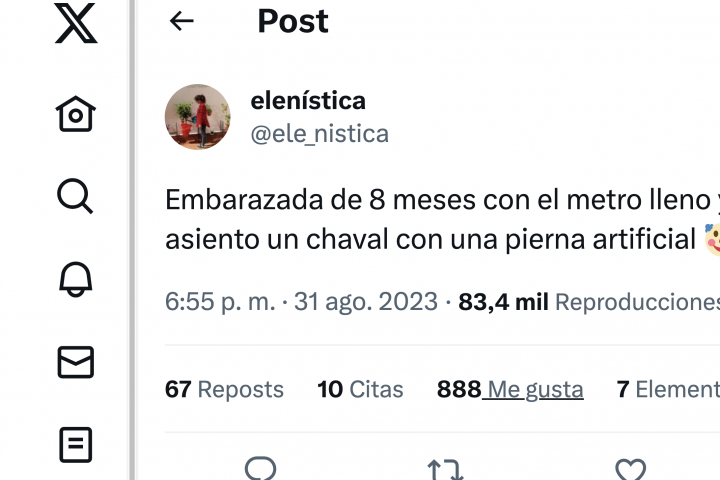 "Embarazada de 8 meses con el metro lleno y el que me ha cedido el asiento un chaval con una pierna artificial", ha contado en un primer mensaje.