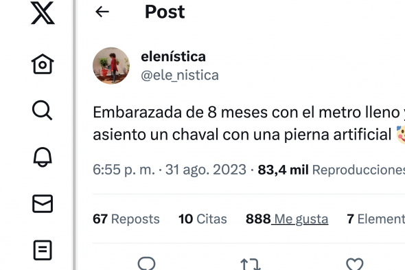 "Embarazada de 8 meses con el metro lleno y el que me ha cedido el asiento un chaval con una pierna artificial", ha contado en un primer mensaje.