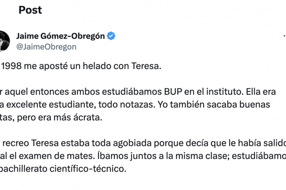 "En 1998 me aposté un helado con Teresa". Con esta breve frase empieza el ingeniero Jaime Gómez-Obregón a contar la historia que vivió en BUP con su compañera de clase a raíz de haberse encontrado una nota.
