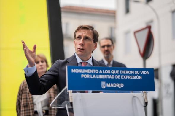 Una paloma ha defecado sobre la cabeza de Almeida. El alcalde de Madrid ha sufrido este percance mientras intervenía en un acto homenaje a los caídos por la libertad de expresión.
